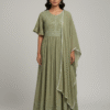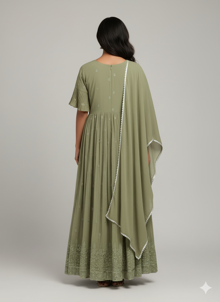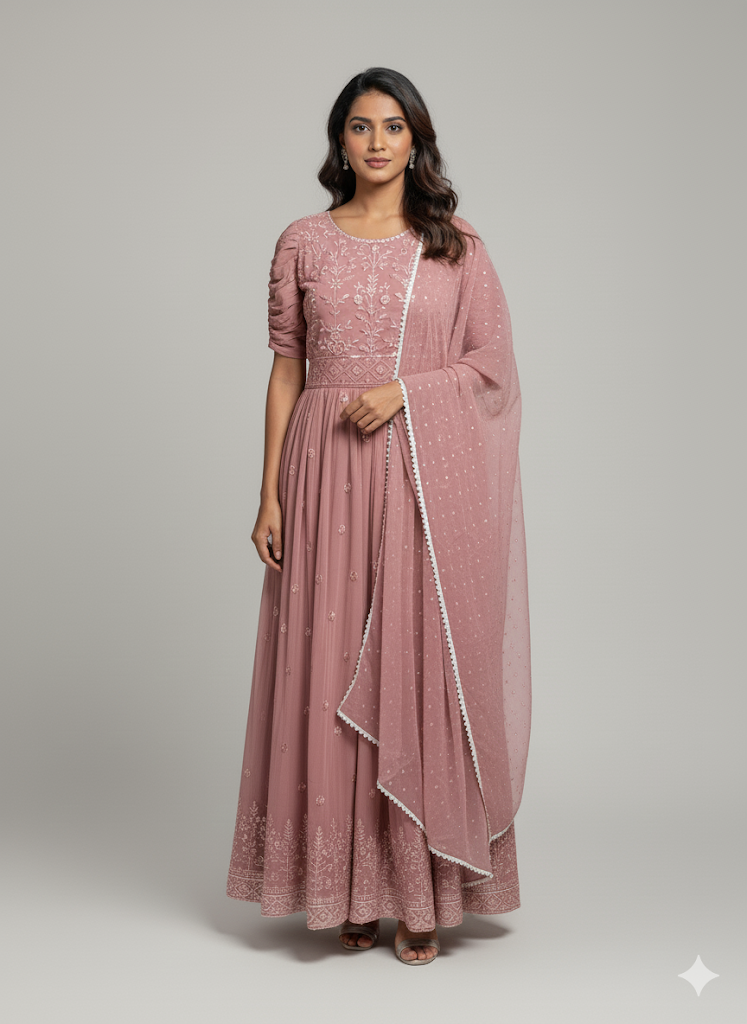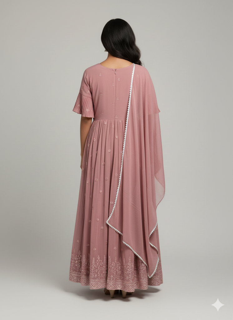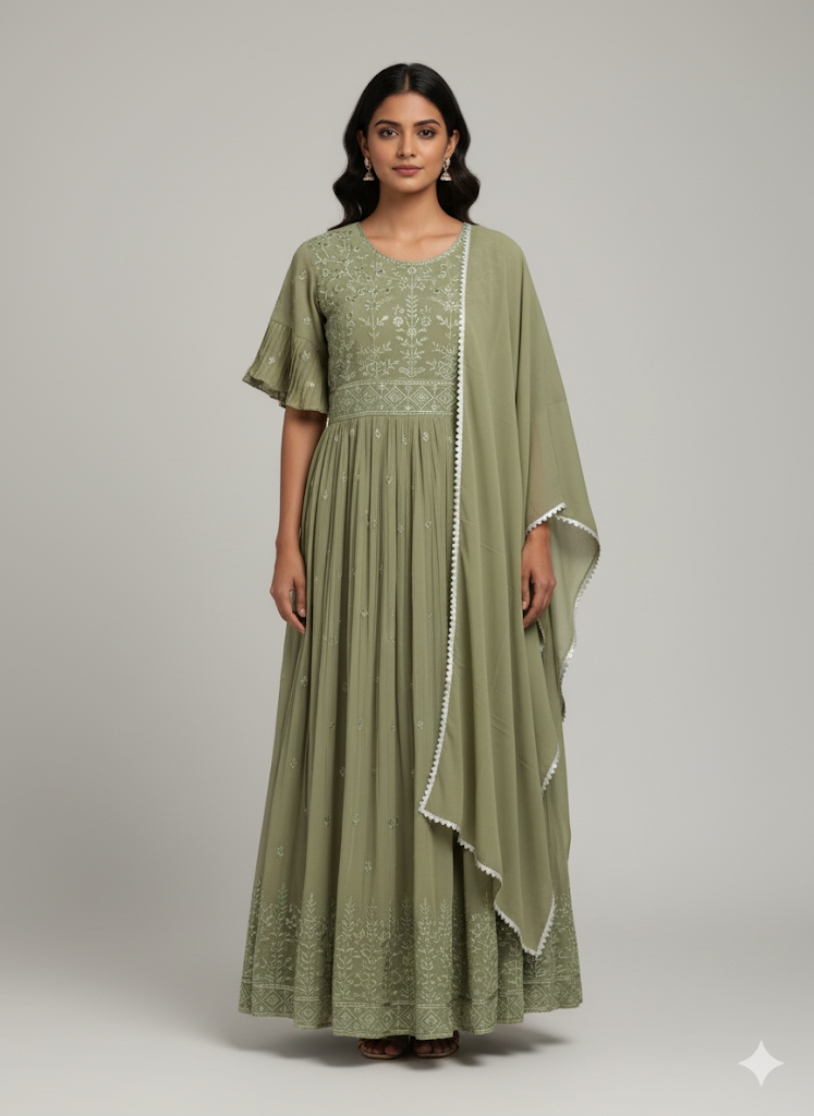 A georgette Anarkali gown with an accompanying dupatta and bottom. The gown has a flared silhouette and embroidery thread work on the yoke and hem. The sleeves are bell-shaped and also feature some detailing. The matching dupatta is also made of georgette. This style is often described as suitable for festive wear or special occasions.